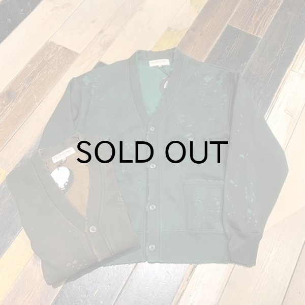 BODY全体に少しムラを出しながら、まんべんなくスプレー吹き付けカラーし、元のカラーをトーンダウンさせ、レーザー加工をした非常に凝ったスウェットカーディガンです。
