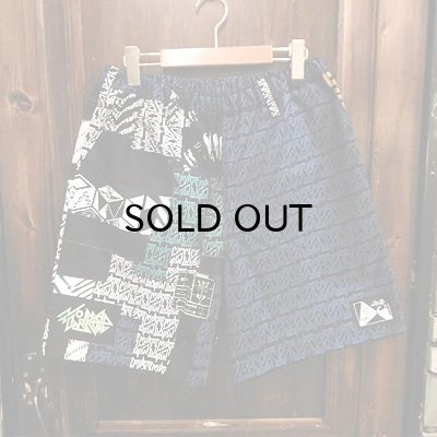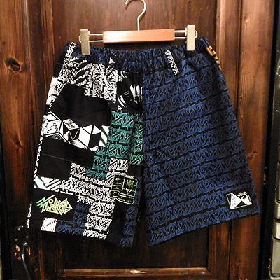 {NO MAD NUMSKULL} ORIGINAL PATTERN SHORT PANTS / LOGO2&PATCHWORK / BLACK×BLUE / (L)