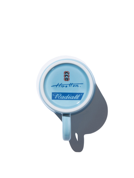 トルコブルーのうわぐすり(釉薬)の淡いブルーの本体に、紺色のプリントでHIROTTONのグラフィックが入ります。
