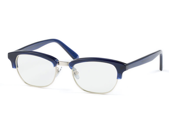 天地幅を抑えたレンズシェイプと、幅広なブリッジを組み合わせたブロウタイプ。
