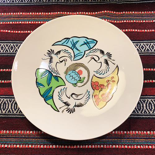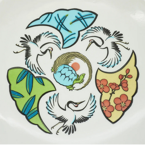 「鶴亀(つるかめ)」とは、長寿と繁栄の象徴であり、「鶴は千年、亀は万年」に由来します。また、鶴は夫婦円満や長寿、亀は知恵と長寿・安定の象徴で、おめでたい文様に用いられます。日の丸は「和」の精神、調和。