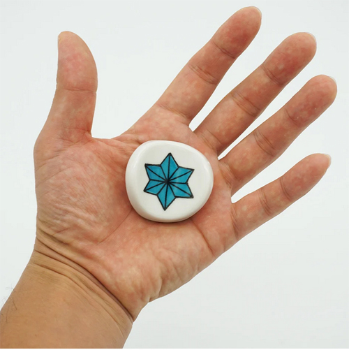 麻柄(あさがら・あさのはがら)は、正六角形を基本とした幾何学模様で、成長が早く丈夫な麻のように「子供の健やかな成長」や「魔除け」の意味が込められ、古くから赤ちゃんの産着(うぶぎ)や和柄として親しまれています。建築、家紋などに用いられ、歌舞伎や現代の着物、和雑貨など幅広く使われている日本の代表的な伝統文様です。絵具も九谷焼の絵具でありながらも九谷の忠実な色に寄せず、「日本の伝統色」を忠実に配色されたものとなっており、九谷焼でありそうでなかった新しい商品に仕上がっています。底面には九九谷のロゴが入ります。